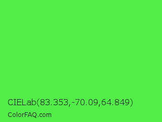 CIELab 83.353,-70.09,64.849 Color is a light green color and the nearest color is Screamin Green #66ff66. Hex code #52ed48 and RGB value is rgb(82,237,72). In RGB color space, this color is composed of 32% red, 93% green, 28% blue, In CMYK color space, this color is composed of 65% cyan, 0% magenta, 70% yellow , 7% black , In HSL color space, this color has a hue angle of 116° , 82% saturation and 61% lightness.