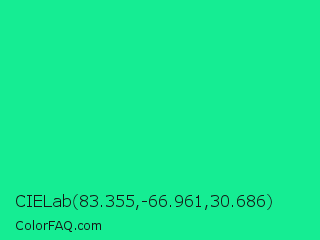 CIELab 83.355,-66.961,30.686 Color is a normal green color and the nearest color is Medium Spring Green #00fa9a. Hex code #15ed93 and RGB value is rgb(21,237,147). In RGB color space, this color is composed of 8% red, 93% green, 58% blue, In CMYK color space, this color is composed of 91% cyan, 0% magenta, 38% yellow , 7% black , In HSL color space, this color has a hue angle of 155° , 86% saturation and 51% lightness.