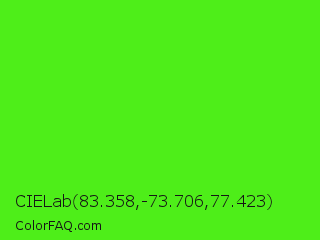 CIELab 83.358,-73.706,77.423 Color is a normal green color and the nearest color is Neon Green #39ff14. Hex code #4eee19 and RGB value is rgb(78,238,25). In RGB color space, this color is composed of 31% red, 93% green, 10% blue, In CMYK color space, this color is composed of 67% cyan, 0% magenta, 89% yellow , 7% black , In HSL color space, this color has a hue angle of 105° , 86% saturation and 52% lightness.