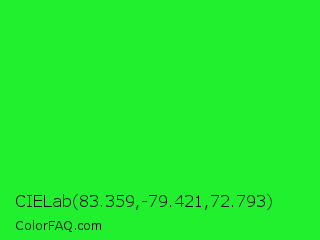 CIELab 83.359,-79.421,72.793 Color is a normal green color and the nearest color is Neon Green #39ff14. Hex code #21f02e and RGB value is rgb(33,240,46). In RGB color space, this color is composed of 13% red, 94% green, 18% blue, In CMYK color space, this color is composed of 86% cyan, 0% magenta, 81% yellow , 6% black , In HSL color space, this color has a hue angle of 124° , 87% saturation and 54% lightness.