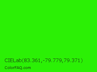 CIELab 83.361,-79.779,79.371 Color is a normal green color and the nearest color is Neon Green #39ff14. Hex code #2bf005 and RGB value is rgb(43,240,5). In RGB color space, this color is composed of 17% red, 94% green, 2% blue, In CMYK color space, this color is composed of 82% cyan, 0% magenta, 98% yellow , 6% black , In HSL color space, this color has a hue angle of 110° , 96% saturation and 48% lightness.
