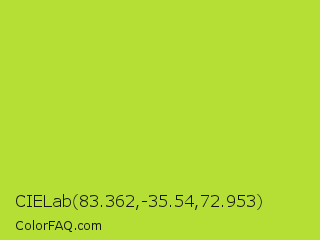 CIELab 83.362,-35.54,72.953 Color is a normal lime color and the nearest color is Green Lizard #a7f432. Hex code #b5df34 and RGB value is rgb(181,223,52). In RGB color space, this color is composed of 71% red, 87% green, 20% blue, In CMYK color space, this color is composed of 19% cyan, 0% magenta, 77% yellow , 13% black , In HSL color space, this color has a hue angle of 75° , 73% saturation and 54% lightness.
