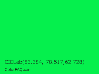 CIELab 83.384,-78.517,62.728 Color is a normal green color and the nearest color is Malachite #0bda51. Hex code #05f04d and RGB value is rgb(5,240,77). In RGB color space, this color is composed of 2% red, 94% green, 30% blue, In CMYK color space, this color is composed of 98% cyan, 0% magenta, 68% yellow , 6% black , In HSL color space, this color has a hue angle of 138° , 96% saturation and 48% lightness.