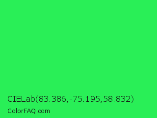 CIELab 83.386,-75.195,58.832 Color is a normal green color and the nearest color is Malachite #0bda51. Hex code #29ef57 and RGB value is rgb(41,239,87). In RGB color space, this color is composed of 16% red, 94% green, 34% blue, In CMYK color space, this color is composed of 83% cyan, 0% magenta, 64% yellow , 6% black , In HSL color space, this color has a hue angle of 134° , 86% saturation and 55% lightness.