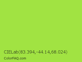 CIELab 83.394,-44.14,68.024 Color is a normal green color and the nearest color is Conifer #acdd4d. Hex code #a1e342 and RGB value is rgb(161,227,66). In RGB color space, this color is composed of 63% red, 89% green, 26% blue, In CMYK color space, this color is composed of 29% cyan, 0% magenta, 71% yellow , 11% black , In HSL color space, this color has a hue angle of 85° , 74% saturation and 57% lightness.