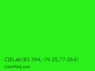 CIELab 83.394,-79.35,77.064 Color is a normal green color and the nearest color is Neon Green #39ff14. Hex code #2bf01a and RGB value is rgb(43,240,26). In RGB color space, this color is composed of 17% red, 94% green, 10% blue, In CMYK color space, this color is composed of 82% cyan, 0% magenta, 89% yellow , 6% black , In HSL color space, this color has a hue angle of 115° , 88% saturation and 52% lightness.