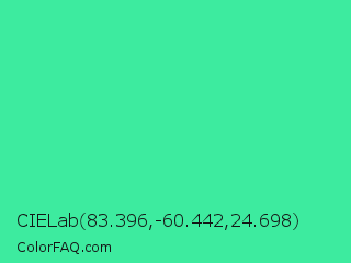CIELab 83.396,-60.442,24.698 Color is a normal green color and the nearest color is Eucalyptus #44d7a8. Hex code #3deb9f and RGB value is rgb(61,235,159). In RGB color space, this color is composed of 24% red, 92% green, 62% blue, In CMYK color space, this color is composed of 74% cyan, 0% magenta, 32% yellow , 8% black , In HSL color space, this color has a hue angle of 154° , 81% saturation and 58% lightness.