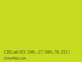 CIELab 83.398,-27.086,78.251 Color is a normal yellow color and the nearest color is Key Lime Pie #bfc921. Hex code #c7db21 and RGB value is rgb(199,219,33). In RGB color space, this color is composed of 78% red, 86% green, 13% blue, In CMYK color space, this color is composed of 9% cyan, 0% magenta, 85% yellow , 14% black , In HSL color space, this color has a hue angle of 66° , 74% saturation and 49% lightness.