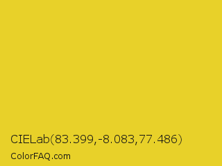 CIELab 83.399,-8.083,77.486 Color is a normal yellow color and the nearest color is Sunflower #e4d422. Hex code #e8d129 and RGB value is rgb(232,209,41). In RGB color space, this color is composed of 91% red, 82% green, 16% blue, In CMYK color space, this color is composed of 0% cyan, 10% magenta, 82% yellow , 9% black , In HSL color space, this color has a hue angle of 53° , 81% saturation and 54% lightness.