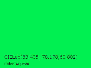 CIELab 83.405,-78.178,60.802 Color is a normal green color and the nearest color is Malachite #0bda51. Hex code #00f052 and RGB value is rgb(0,240,82). In RGB color space, this color is composed of 0% red, 94% green, 32% blue, In CMYK color space, this color is composed of 100% cyan, 0% magenta, 66% yellow , 6% black , In HSL color space, this color has a hue angle of 141° , 100% saturation and 47% lightness.