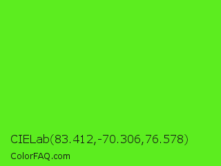 CIELab 83.412,-70.306,76.578 Color is a normal green color and the nearest color is Bright Green #66ff00. Hex code #5ced1f and RGB value is rgb(92,237,31). In RGB color space, this color is composed of 36% red, 93% green, 12% blue, In CMYK color space, this color is composed of 61% cyan, 0% magenta, 87% yellow , 7% black , In HSL color space, this color has a hue angle of 102° , 85% saturation and 53% lightness.
