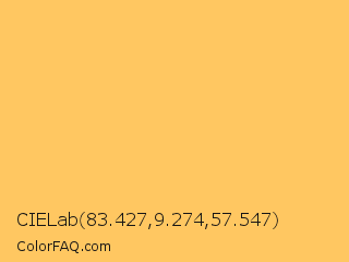 CIELab 83.427,9.274,57.547 Color is a light orange color and the nearest color is Golden Tainoi #ffcc5c. Hex code #ffc761 and RGB value is rgb(255,199,97). In RGB color space, this color is composed of 100% red, 78% green, 38% blue, In CMYK color space, this color is composed of 0% cyan, 22% magenta, 62% yellow , 0% black , In HSL color space, this color has a hue angle of 39° , 100% saturation and 69% lightness.