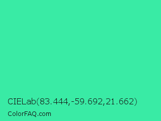 CIELab 83.444,-59.692,21.662 Color is a normal green color and the nearest color is Eucalyptus #44d7a8. Hex code #39eba5 and RGB value is rgb(57,235,165). In RGB color space, this color is composed of 22% red, 92% green, 65% blue, In CMYK color space, this color is composed of 76% cyan, 0% magenta, 30% yellow , 8% black , In HSL color space, this color has a hue angle of 156° , 82% saturation and 57% lightness.