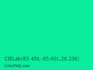 CIELab 83.456,-65.601,26.236 Color is a normal green color and the nearest color is Medium Spring Green #00fa9a. Hex code #09ed9c and RGB value is rgb(9,237,156). In RGB color space, this color is composed of 4% red, 93% green, 61% blue, In CMYK color space, this color is composed of 96% cyan, 0% magenta, 34% yellow , 7% black , In HSL color space, this color has a hue angle of 159° , 93% saturation and 48% lightness.