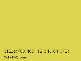 CIELab 83.463,-12.541,64.072 Color is a normal yellow color and the nearest color is Wattle #dcd747. Hex code #ddd450 and RGB value is rgb(221,212,80). In RGB color space, this color is composed of 87% red, 83% green, 31% blue, In CMYK color space, this color is composed of 0% cyan, 4% magenta, 64% yellow , 13% black , In HSL color space, this color has a hue angle of 56° , 67% saturation and 59% lightness.