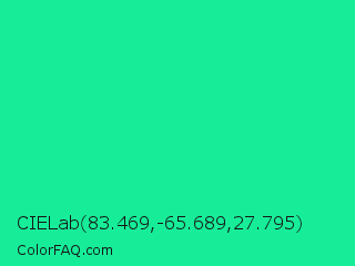 CIELab 83.469,-65.689,27.795 Color is a normal green color and the nearest color is Medium Spring Green #00fa9a. Hex code #17ed99 and RGB value is rgb(23,237,153). In RGB color space, this color is composed of 9% red, 93% green, 60% blue, In CMYK color space, this color is composed of 90% cyan, 0% magenta, 35% yellow , 7% black , In HSL color space, this color has a hue angle of 156° , 86% saturation and 51% lightness.