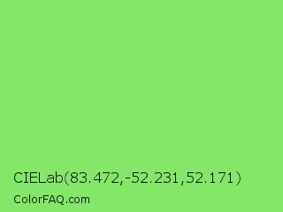 CIELab 83.472,-52.231,52.171 Color is a light green color and the nearest color is Pastel Green #77dd77. Hex code #84e768 and RGB value is rgb(132,231,104). In RGB color space, this color is composed of 52% red, 91% green, 41% blue, In CMYK color space, this color is composed of 43% cyan, 0% magenta, 55% yellow , 9% black , In HSL color space, this color has a hue angle of 107° , 73% saturation and 66% lightness.