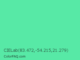 CIELab 83.472,-54.215,21.279 Color is a light green color and the nearest color is Medium Aquamarine #66ddaa. Hex code #57e9a6 and RGB value is rgb(87,233,166). In RGB color space, this color is composed of 34% red, 91% green, 65% blue, In CMYK color space, this color is composed of 63% cyan, 0% magenta, 29% yellow , 9% black , In HSL color space, this color has a hue angle of 152° , 77% saturation and 63% lightness.