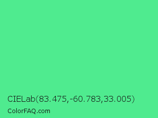 CIELab 83.475,-60.783,33.005 Color is a light green color and the nearest color is Very Light Malachite Green #64e986. Hex code #4feb8f and RGB value is rgb(79,235,143). In RGB color space, this color is composed of 31% red, 92% green, 56% blue, In CMYK color space, this color is composed of 66% cyan, 0% magenta, 39% yellow , 8% black , In HSL color space, this color has a hue angle of 145° , 80% saturation and 62% lightness.