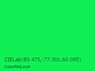CIELab 83.475,-77.501,60.095 Color is a normal green color and the nearest color is Malachite #0bda51. Hex code #0ff054 and RGB value is rgb(15,240,84). In RGB color space, this color is composed of 6% red, 94% green, 33% blue, In CMYK color space, this color is composed of 94% cyan, 0% magenta, 65% yellow , 6% black , In HSL color space, this color has a hue angle of 138° , 88% saturation and 50% lightness.