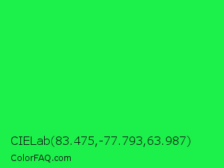 CIELab 83.475,-77.793,63.987 Color is a normal green color and the nearest color is Malachite #0bda51. Hex code #1cf04a and RGB value is rgb(28,240,74). In RGB color space, this color is composed of 11% red, 94% green, 29% blue, In CMYK color space, this color is composed of 88% cyan, 0% magenta, 69% yellow , 6% black , In HSL color space, this color has a hue angle of 133° , 88% saturation and 53% lightness.