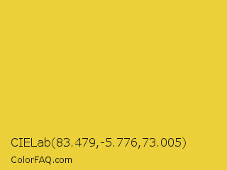 CIELab 83.479,-5.776,73.005 Color is a normal yellow color and the nearest color is Sandstorm #ecd540. Hex code #ebd039 and RGB value is rgb(235,208,57). In RGB color space, this color is composed of 92% red, 82% green, 22% blue, In CMYK color space, this color is composed of 0% cyan, 11% magenta, 76% yellow , 8% black , In HSL color space, this color has a hue angle of 51° , 82% saturation and 57% lightness.