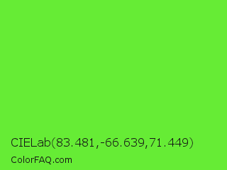 CIELab 83.481,-66.639,71.449 Color is a normal green color and the nearest color is Spring Frost #87ff2a. Hex code #66ec35 and RGB value is rgb(102,236,53). In RGB color space, this color is composed of 40% red, 93% green, 21% blue, In CMYK color space, this color is composed of 57% cyan, 0% magenta, 78% yellow , 7% black , In HSL color space, this color has a hue angle of 104° , 83% saturation and 57% lightness.