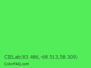 CIELab 83.486,-68.513,58.309 Color is a light green color and the nearest color is Screamin Green #66ff66. Hex code #52ed59 and RGB value is rgb(82,237,89). In RGB color space, this color is composed of 32% red, 93% green, 35% blue, In CMYK color space, this color is composed of 65% cyan, 0% magenta, 62% yellow , 7% black , In HSL color space, this color has a hue angle of 123° , 81% saturation and 63% lightness.