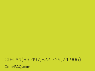 CIELab 83.497,-22.359,74.906 Color is a normal yellow color and the nearest color is Pear #d1e231. Hex code #cfd930 and RGB value is rgb(207,217,48). In RGB color space, this color is composed of 81% red, 85% green, 19% blue, In CMYK color space, this color is composed of 5% cyan, 0% magenta, 78% yellow , 15% black , In HSL color space, this color has a hue angle of 64° , 69% saturation and 52% lightness.