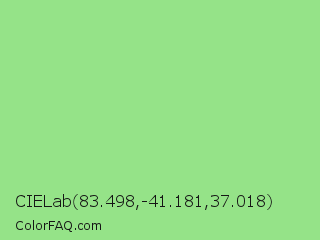 CIELab 83.498,-41.181,37.018 Color is a light green color and the nearest color is Feijoa #9fdd8c. Hex code #95e388 and RGB value is rgb(149,227,136). In RGB color space, this color is composed of 58% red, 89% green, 53% blue, In CMYK color space, this color is composed of 34% cyan, 0% magenta, 40% yellow , 11% black , In HSL color space, this color has a hue angle of 111° , 62% saturation and 71% lightness.