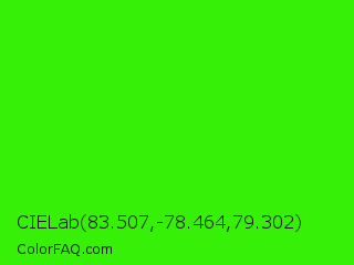 CIELab 83.507,-78.464,79.302 Color is a normal green color and the nearest color is Harlequin #3fff00. Hex code #36f008 and RGB value is rgb(54,240,8). In RGB color space, this color is composed of 21% red, 94% green, 3% blue, In CMYK color space, this color is composed of 78% cyan, 0% magenta, 97% yellow , 6% black , In HSL color space, this color has a hue angle of 108° , 94% saturation and 49% lightness.