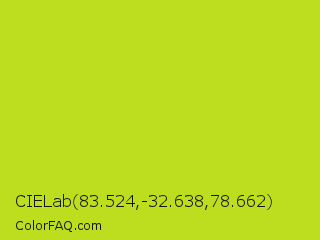 CIELab 83.524,-32.638,78.662 Color is a normal yellow color and the nearest color is Fuego #bede0d. Hex code #bdde1e and RGB value is rgb(189,222,30). In RGB color space, this color is composed of 74% red, 87% green, 12% blue, In CMYK color space, this color is composed of 15% cyan, 0% magenta, 86% yellow , 13% black , In HSL color space, this color has a hue angle of 70° , 76% saturation and 49% lightness.