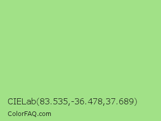CIELab 83.535,-36.478,37.689 Color is a light green color and the nearest color is Feijoa #9fdd8c. Hex code #a1e187 and RGB value is rgb(161,225,135). In RGB color space, this color is composed of 63% red, 88% green, 53% blue, In CMYK color space, this color is composed of 28% cyan, 0% magenta, 40% yellow , 12% black , In HSL color space, this color has a hue angle of 103° , 60% saturation and 71% lightness.