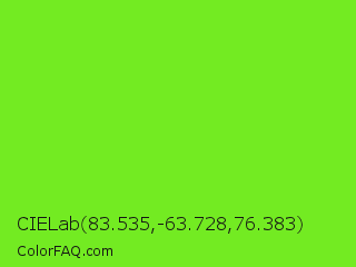 CIELab 83.535,-63.728,76.383 Color is a normal green color and the nearest color is Spring Frost #87ff2a. Hex code #73eb22 and RGB value is rgb(115,235,34). In RGB color space, this color is composed of 45% red, 92% green, 13% blue, In CMYK color space, this color is composed of 51% cyan, 0% magenta, 86% yellow , 8% black , In HSL color space, this color has a hue angle of 96° , 83% saturation and 53% lightness.