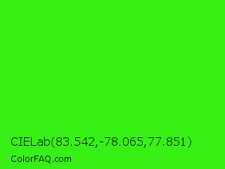 CIELab 83.542,-78.065,77.851 Color is a normal green color and the nearest color is Neon Green #39ff14. Hex code #37f016 and RGB value is rgb(55,240,22). In RGB color space, this color is composed of 22% red, 94% green, 9% blue, In CMYK color space, this color is composed of 77% cyan, 0% magenta, 91% yellow , 6% black , In HSL color space, this color has a hue angle of 111° , 88% saturation and 51% lightness.