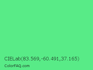 CIELab 83.569,-60.491,37.165 Color is a light green color and the nearest color is Very Light Malachite Green #64e986. Hex code #58eb87 and RGB value is rgb(88,235,135). In RGB color space, this color is composed of 35% red, 92% green, 53% blue, In CMYK color space, this color is composed of 63% cyan, 0% magenta, 43% yellow , 8% black , In HSL color space, this color has a hue angle of 139° , 79% saturation and 63% lightness.