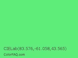 CIELab 83.576,-61.058,43.565 Color is a light green color and the nearest color is Very Light Malachite Green #64e986. Hex code #5feb7a and RGB value is rgb(95,235,122). In RGB color space, this color is composed of 37% red, 92% green, 48% blue, In CMYK color space, this color is composed of 60% cyan, 0% magenta, 48% yellow , 8% black , In HSL color space, this color has a hue angle of 132° , 78% saturation and 65% lightness.