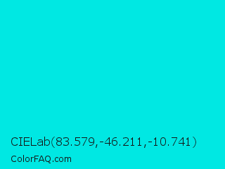 CIELab 83.579,-46.211,-10.741 Color is a normal cyan color and the nearest color is Bright Turquoise #08e8de. Hex code #00e8e3 and RGB value is rgb(0,232,227). In RGB color space, this color is composed of 0% red, 91% green, 89% blue, In CMYK color space, this color is composed of 100% cyan, 0% magenta, 2% yellow , 9% black , In HSL color space, this color has a hue angle of 179° , 100% saturation and 45% lightness.