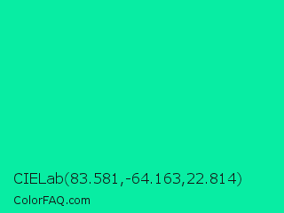 CIELab 83.581,-64.163,22.814 Color is a normal green color and the nearest color is Medium Spring Green #00fa9a. Hex code #08eda3 and RGB value is rgb(8,237,163). In RGB color space, this color is composed of 3% red, 93% green, 64% blue, In CMYK color space, this color is composed of 97% cyan, 0% magenta, 31% yellow , 7% black , In HSL color space, this color has a hue angle of 161° , 93% saturation and 48% lightness.