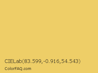 CIELab 83.599,-0.916,54.543 Color is a light yellow color and the nearest color is Hansa Yellow #e9d66b. Hex code #eece67 and RGB value is rgb(238,206,103). In RGB color space, this color is composed of 93% red, 81% green, 40% blue, In CMYK color space, this color is composed of 0% cyan, 13% magenta, 57% yellow , 7% black , In HSL color space, this color has a hue angle of 46° , 80% saturation and 67% lightness.