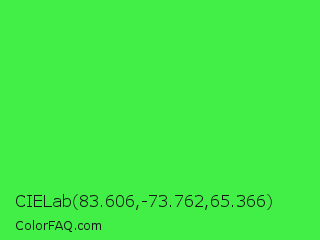 CIELab 83.606,-73.762,65.366 Color is a normal green color and the nearest color is Lime Green #32cd32. Hex code #41ef47 and RGB value is rgb(65,239,71). In RGB color space, this color is composed of 25% red, 94% green, 28% blue, In CMYK color space, this color is composed of 73% cyan, 0% magenta, 70% yellow , 6% black , In HSL color space, this color has a hue angle of 122° , 84% saturation and 60% lightness.