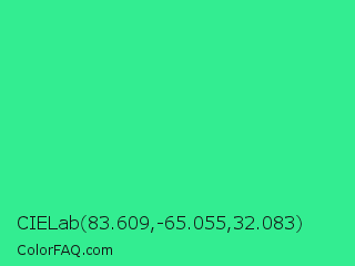 CIELab 83.609,-65.055,32.083 Color is a normal green color and the nearest color is Shamrock #33cc99. Hex code #33ed91 and RGB value is rgb(51,237,145). In RGB color space, this color is composed of 20% red, 93% green, 57% blue, In CMYK color space, this color is composed of 78% cyan, 0% magenta, 39% yellow , 7% black , In HSL color space, this color has a hue angle of 150° , 84% saturation and 56% lightness.