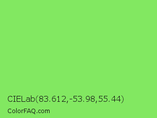 CIELab 83.612,-53.98,55.44 Color is a light green color and the nearest color is Pastel Green #77dd77. Hex code #82e861 and RGB value is rgb(130,232,97). In RGB color space, this color is composed of 51% red, 91% green, 38% blue, In CMYK color space, this color is composed of 44% cyan, 0% magenta, 58% yellow , 9% black , In HSL color space, this color has a hue angle of 105° , 75% saturation and 65% lightness.
