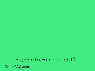 CIELab 83.616,-65.747,39.1 Color is a normal green color and the nearest color is UFO Green #3cd070. Hex code #41ed83 and RGB value is rgb(65,237,131). In RGB color space, this color is composed of 25% red, 93% green, 51% blue, In CMYK color space, this color is composed of 73% cyan, 0% magenta, 45% yellow , 7% black , In HSL color space, this color has a hue angle of 143° , 83% saturation and 59% lightness.