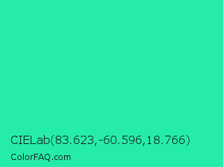 CIELab 83.623,-60.596,18.766 Color is a normal green color and the nearest color is Eucalyptus #44d7a8. Hex code #26ecab and RGB value is rgb(38,236,171). In RGB color space, this color is composed of 15% red, 93% green, 67% blue, In CMYK color space, this color is composed of 84% cyan, 0% magenta, 28% yellow , 7% black , In HSL color space, this color has a hue angle of 160° , 84% saturation and 54% lightness.