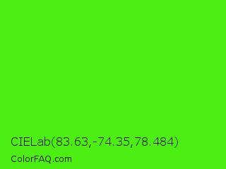 CIELab 83.63,-74.35,78.484 Color is a normal green color and the nearest color is Chlorophyll Green #4aff00. Hex code #4def13 and RGB value is rgb(77,239,19). In RGB color space, this color is composed of 30% red, 94% green, 7% blue, In CMYK color space, this color is composed of 68% cyan, 0% magenta, 92% yellow , 6% black , In HSL color space, this color has a hue angle of 104° , 87% saturation and 51% lightness.