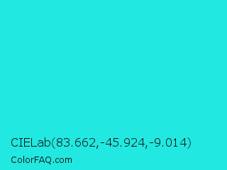 CIELab 83.662,-45.924,-9.014 Color is a normal cyan color and the nearest color is Bright Turquoise #08e8de. Hex code #21e8e0 and RGB value is rgb(33,232,224). In RGB color space, this color is composed of 13% red, 91% green, 88% blue, In CMYK color space, this color is composed of 86% cyan, 0% magenta, 3% yellow , 9% black , In HSL color space, this color has a hue angle of 178° , 81% saturation and 52% lightness.