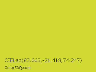 CIELab 83.663,-21.418,74.247 Color is a normal yellow color and the nearest color is Pear #d1e231. Hex code #d1d933 and RGB value is rgb(209,217,51). In RGB color space, this color is composed of 82% red, 85% green, 20% blue, In CMYK color space, this color is composed of 4% cyan, 0% magenta, 76% yellow , 15% black , In HSL color space, this color has a hue angle of 63° , 69% saturation and 53% lightness.