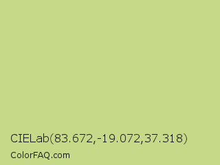 CIELab 83.672,-19.072,37.318 Color is a light lime color and the nearest color is Medium Spring Bud #c9dc87. Hex code #c6d989 and RGB value is rgb(198,217,137). In RGB color space, this color is composed of 78% red, 85% green, 54% blue, In CMYK color space, this color is composed of 9% cyan, 0% magenta, 37% yellow , 15% black , In HSL color space, this color has a hue angle of 74° , 51% saturation and 69% lightness.