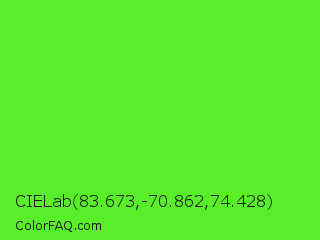CIELab 83.673,-70.862,74.428 Color is a normal green color and the nearest color is Neon Green #39ff14. Hex code #59ee2a and RGB value is rgb(89,238,42). In RGB color space, this color is composed of 35% red, 93% green, 16% blue, In CMYK color space, this color is composed of 63% cyan, 0% magenta, 82% yellow , 7% black , In HSL color space, this color has a hue angle of 106° , 85% saturation and 55% lightness.